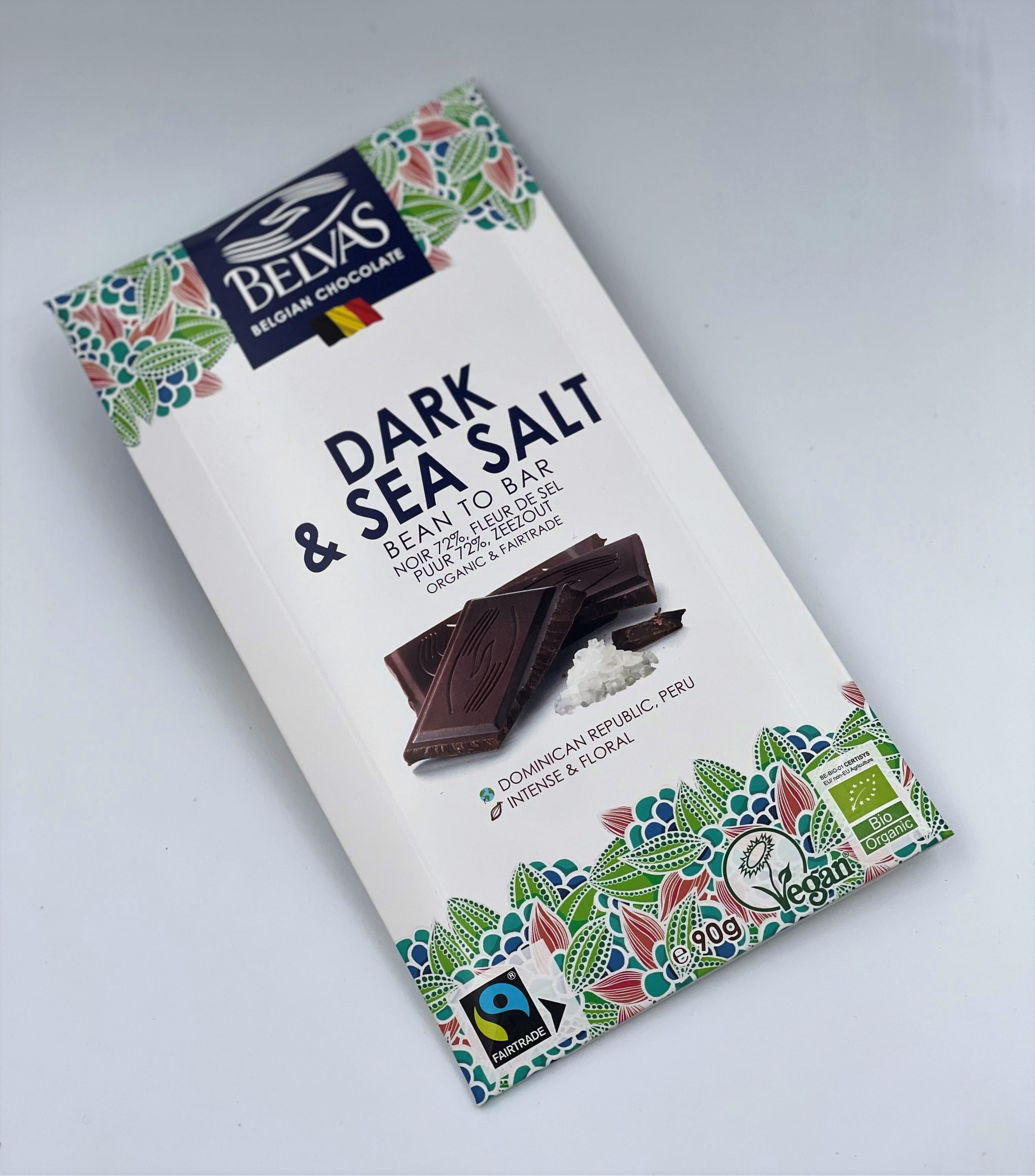 Složení: kakaová hmota*, nerafinovaný třtinový cukr*, kakaové máslo*, solný květ (Missolonghi, GR). * = produkty certifikovaného ekologického zemědělství. Celkový podíl certifikovaných Fairtrade produktů = 95 %.Možné stopy: mandle, lískové ořechy, pistácie, mléko a sója.Nutriční hodnoty ve 100 g: energetická hodnota 2350 kJ / 567 kcal; tuky 43g (z toho nasycené mastné kyseliny 27g); sacharidy 31g (z toho cukr 26g); bílkoviny 11g, sůl 0,5g. Uchovejte v suchu a chladu. Vyrobeno v Belgii. Dovozce: Chocotherapia s.r.o., Loosova 1, 638 00 Brno. Hmotnost: 90 g. Minimální trvanlivost do: viz obal.