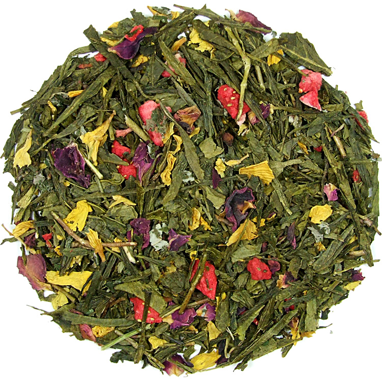 Delikátní zelený aromatizovaný čaj, čajové lístky kvalitního čaje China Sencha s kombinací lahodných lyofilizovaných jahod, květu slunečnice, listů malin a růží. Lístky China Sencha mají nasládlé tóny, střední svíravost a pikantní dochuť. Delikátní sladkou chuť dodává čerstvé a výběrové ovoce.