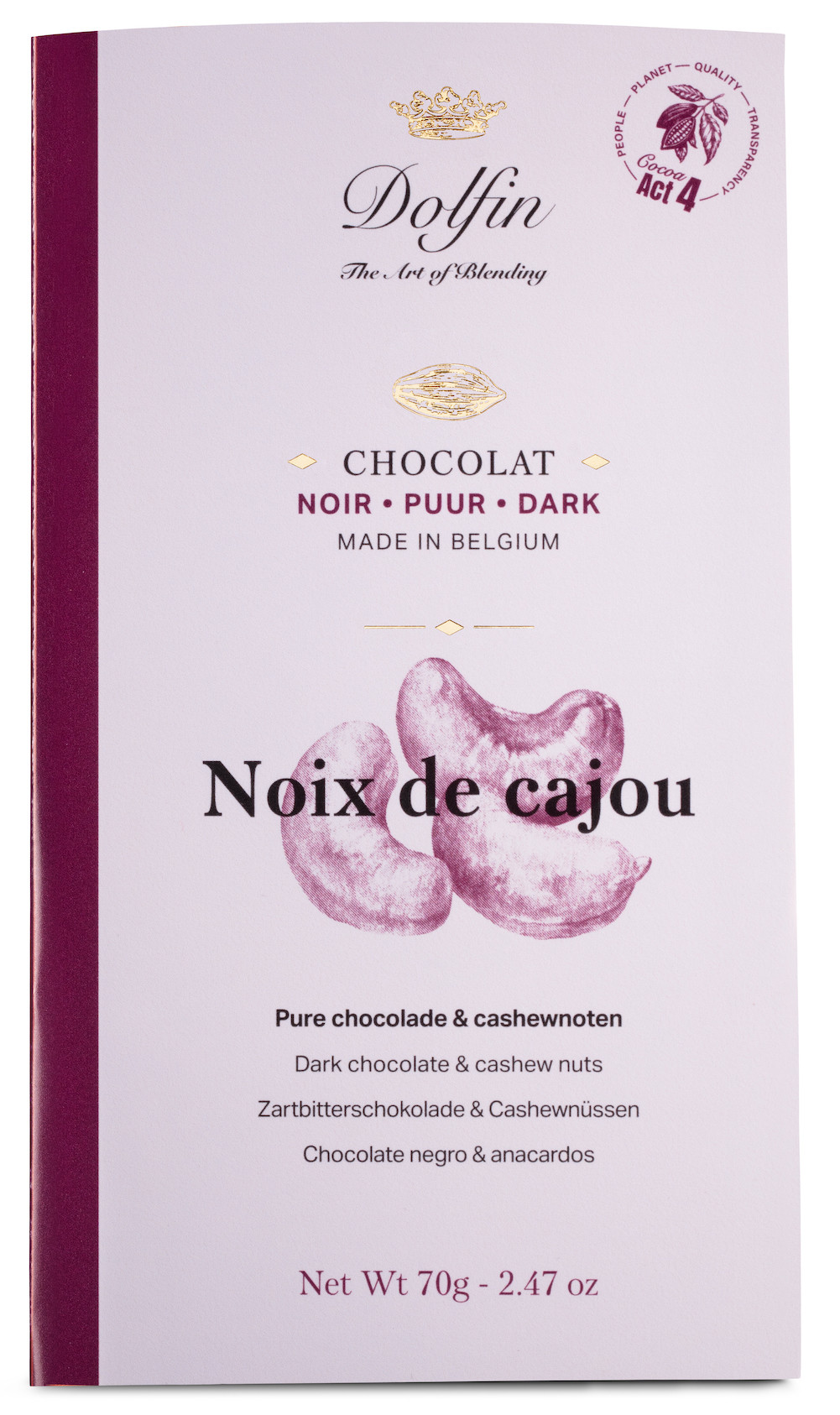 Křupavé kešu oříšky se báječně mísí s hořkou čokoládou rozpouštějící se v ústech.