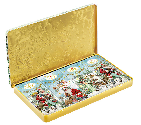 Mléčná čokoláda v atraktivní vánoční plechové kazetě.