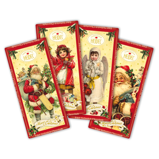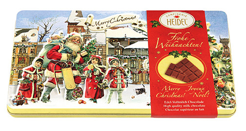 Jemná mléčná čokoláda (minimální podíl kakaové sušiny 37 %) v dárkové kovové kazetě s vánočním motivem (2 varianty).
