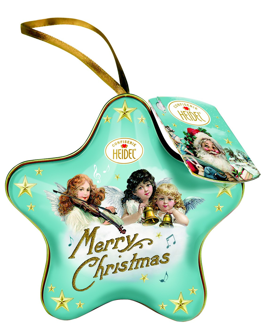 Vánoční dárkové balení pralinek z mléčné čokolády s nugátovou náplní v atraktivním kovovém pouzdru ve tvaru hvězdy. opatřeno poutkem k zavěšení.