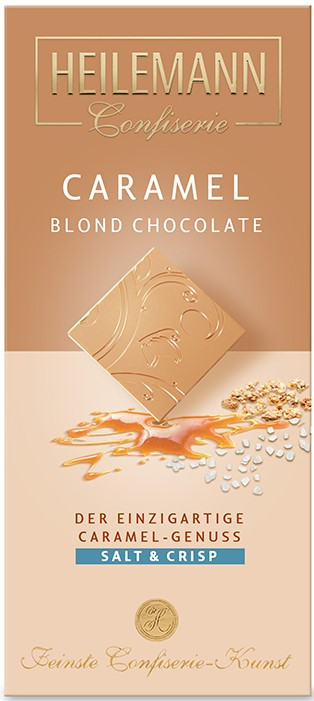 Bílá čokoláda s karamelizovaným mléčným práškem, kousky karamelu (4%) a solí (0,9%).