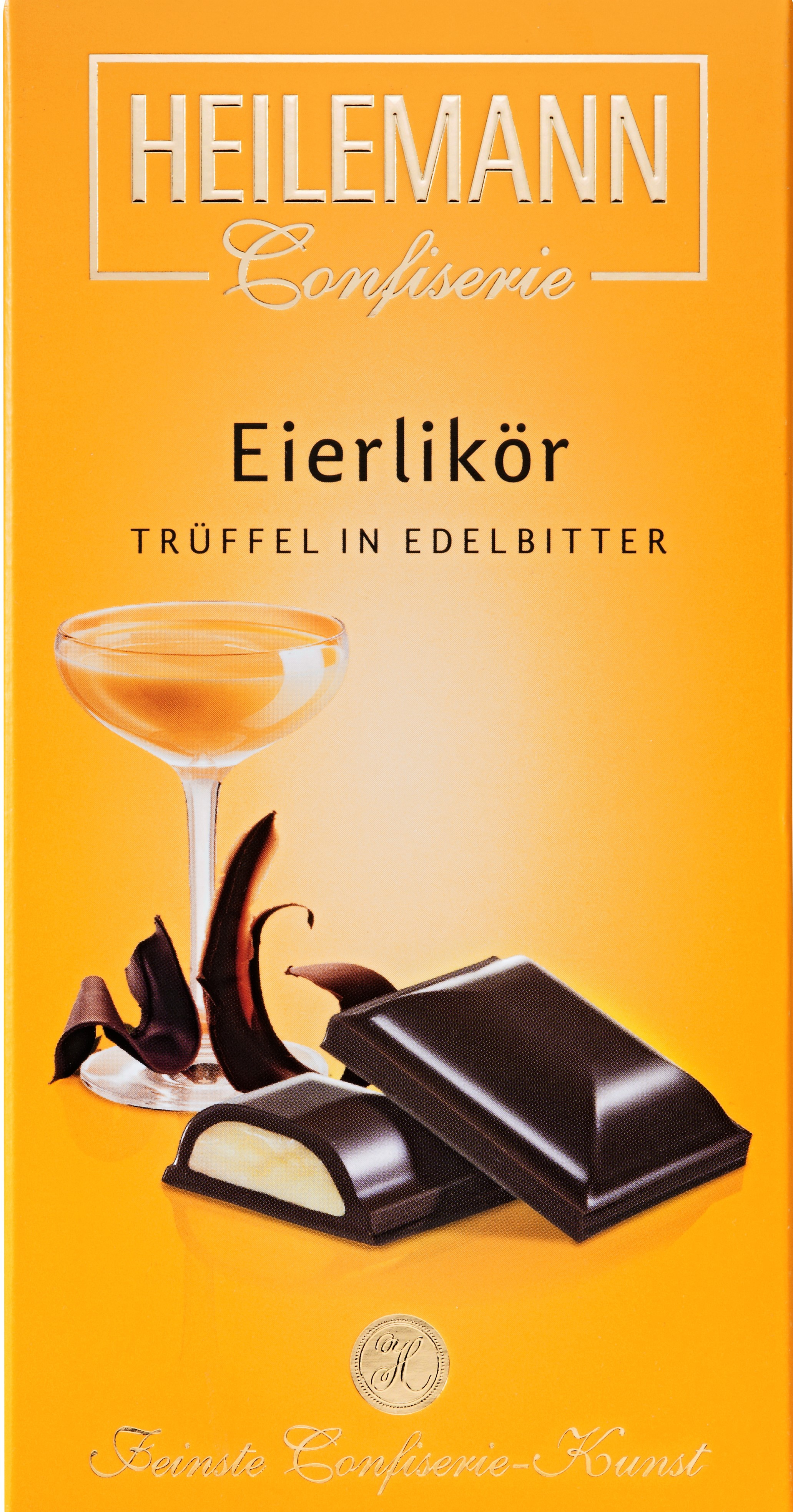 Jemná hořká čokoláda s krémovou náplní (33%) s vaječným likérem.