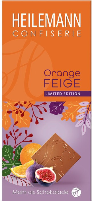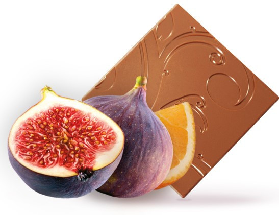 Složení: cukr, kakaové máslo, kakaová hmota, SUŠENÉ PLNOTUČNÉ MLÉKO, sušený fíkový prášek (2 %), pomerančový granulát (0,6 %) (pomerančová dužina, jablka, ananasová vláknina, okyselující prostředek: kyselina citronová; želírující látka: alginát sodný; stabilizátor: vápník fosfát), emulgátor: lecitin (SÓJA); přírodní vanilkové aroma, přírodní pomerančové aroma (<0,01%).