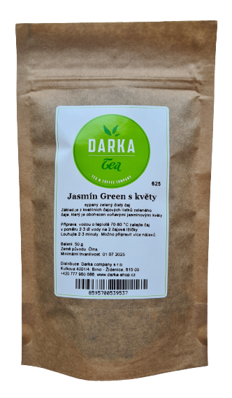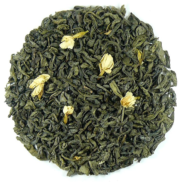 Vynikající jasmínový zelený sypaný čaj z Číny Jasmín Green s květy. Druhy jasmínových čajů jsou nejznámější vonné čaje v celé Číně. Základ je z kvalitních čínských čajových lístků zeleného čaje, který je obohacen luxusním jasmínem. Jasmínové čaje se staly velmi oblíbenými nejen díky krásné vůni ale také velmi lahodné chuti.