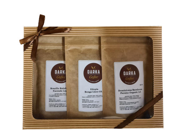 Složení: 50 g Etiopie Yirgacheffe, 50 g Peru Papagayo Organic, 50 g Dominicana Barahona AA Paraiso Organic, 50 g Brazílie Rainforest Facenda Lagoa.