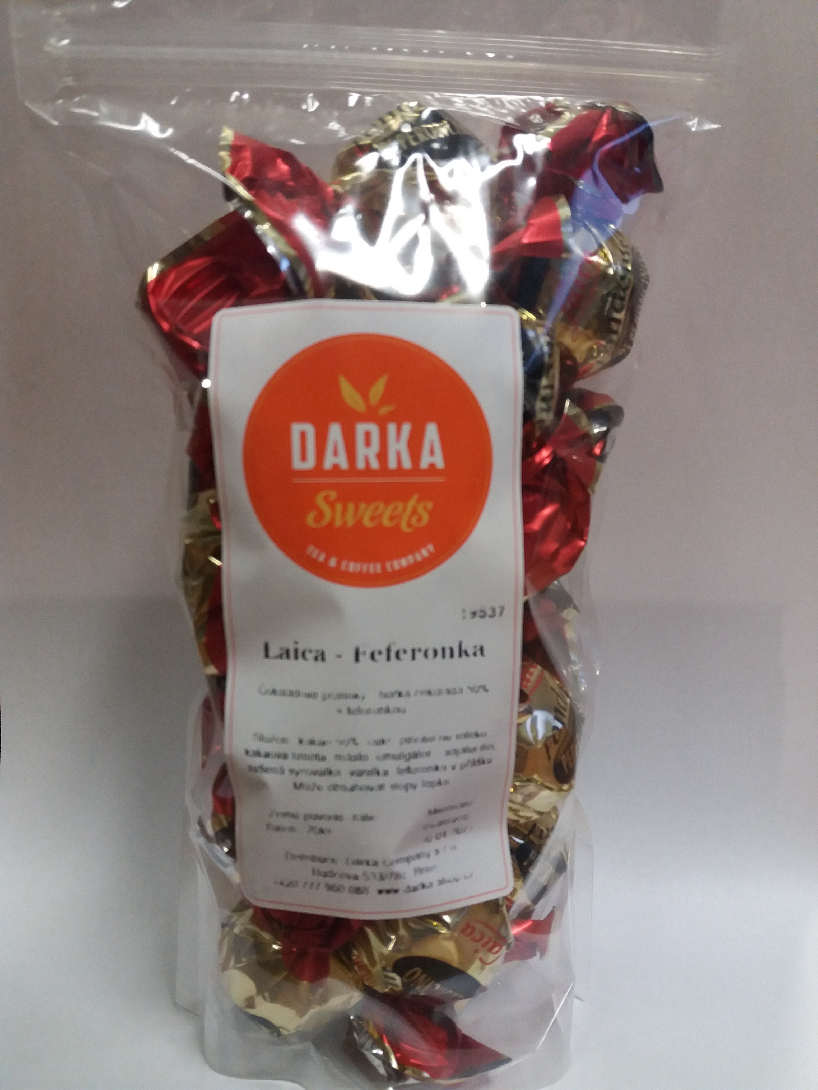 Hořká čokoláda 50% - feferonka Složení: kakao 50%, cukr, plnotučné mléko, kakaová hmota, máslo, emulgátor - sojalecitin, sušená syrovátka, vanilka, feferonka v přášku. Může obsahovat stopy lepku.