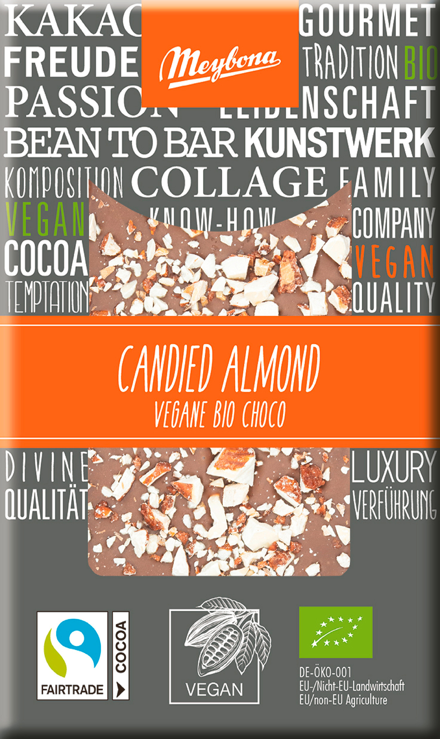 BIO veganská mléčná čokoláda s rýžovým sirupem, ovesnou moukou, sypaná kousky mandlí a pákistánskou kamennou solí.