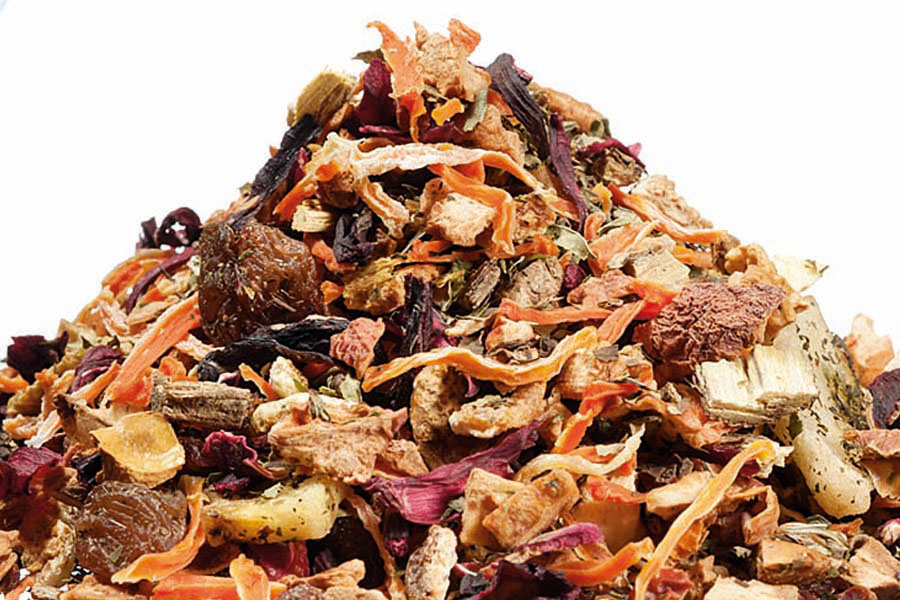 Složení: BIO kousky jablek, BIO sultánky (BIO sultánky, separátor: BIO slunečnicový olej), BIO banánové lupínky (BIO banány, BIO kokosový olej, BIO surový třtinový cukr), BIO ibišek, BIO kousky mrkve, BIO lístky máty, BIO lékořice kořen, BIO citrónová kůra, BIO pomerančová kůra, přírodní aroma.