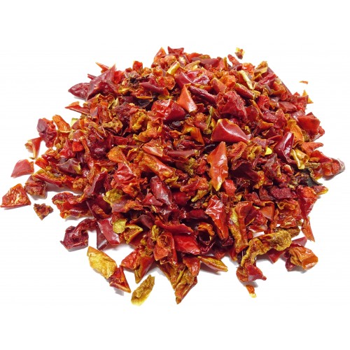 Kvalitní koření Paprikové floky červené jsou sušené kousky papriky vhodné k dochucování gulášů, polévek, omáček, těstovin, do pečiva, nakládaných sýrů, salámů, klobás, masitých a zeleninových jídel.