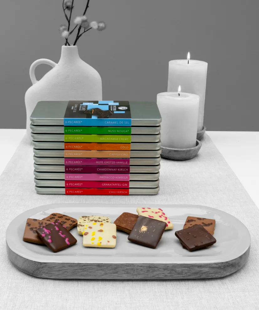 Pro opravdové znalce: Pecarée Truffle s pistáciovým krémem kombinují mléčnou čokoládu, která se rozplývá v ústech, s lahodně krémovou náplní z nejjemnější pistáciové pasty. Oříškový, lehce sladký tón pistácií dokonale ladí s jemností čokolády a vytváří tak nesrovnatelný chuťový zážitek. Šest delikátních tabulek, které kombinují plnou chuť s nejjemnějším řemeslným zpracováním – pro chvíle požitku plné noblesy. Musí mít všichni milovníci pistácií!