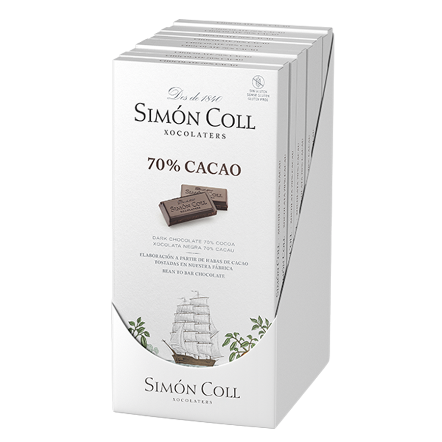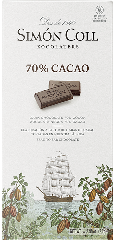 Extra jemná hořká čokoláda 70% bez lepku. Vyrobeno „od bobu po tabulku“.
