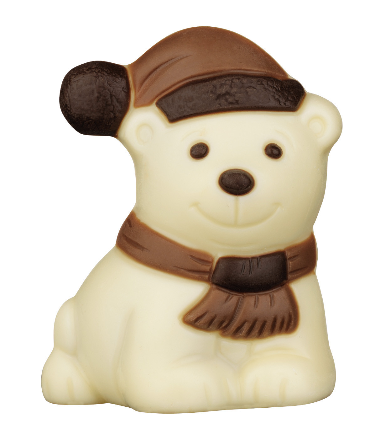 Figurka z bílé čokolády (minimální podíl kakaové sušiny: 33%), dekorovaná. Baleno v celofánovém sáčku se stužkou.