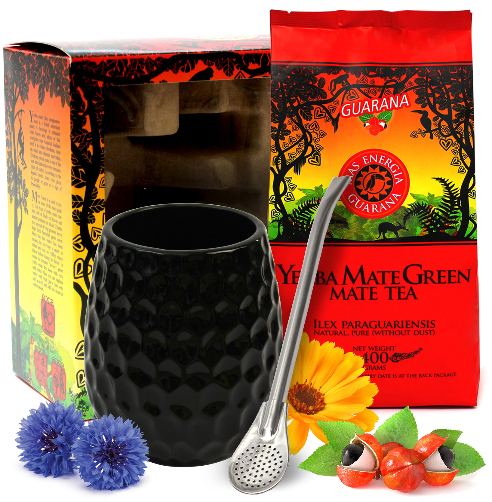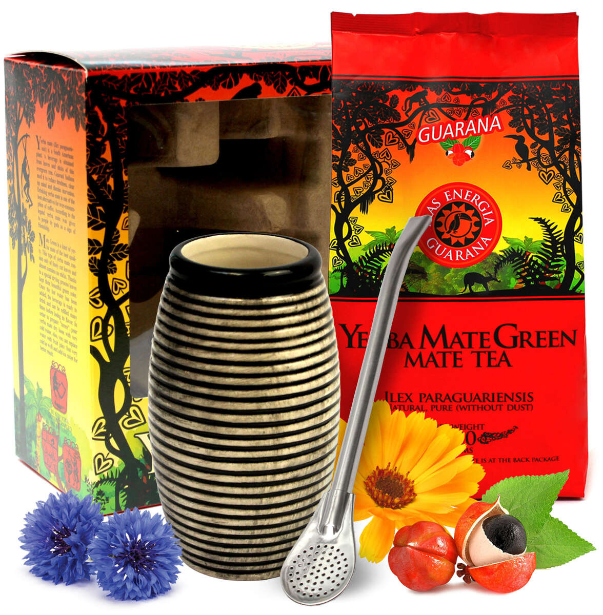 Lahodný povzbudivý bylinný čaj Yerba Maté Rio je delikátní směs čerstvého maté s Guaranou, která dává nápoji příjemné aroma a lahodnou chuť. V sadě se dále nachází Keramická kalabasa 400ml s průhyby a bombilla. Čaj je tradiční jihoamerický nápoj, který se podává v kalabase a popíjí bombillou.